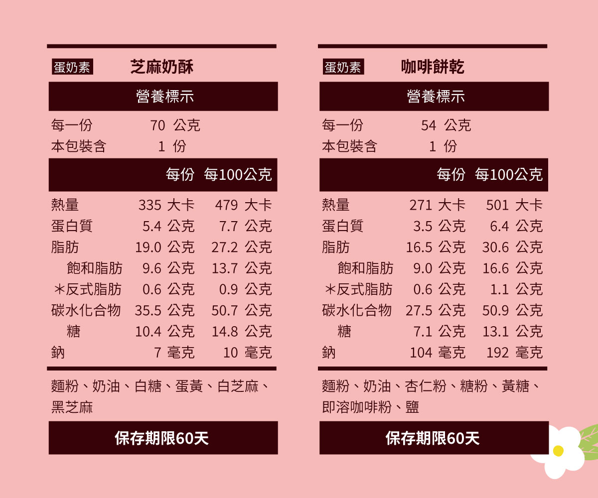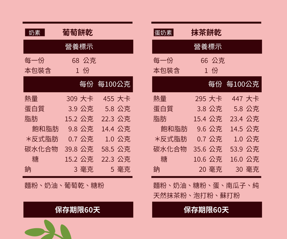 ※除葡萄餅乾為奶素,其餘品項皆為蛋奶素
