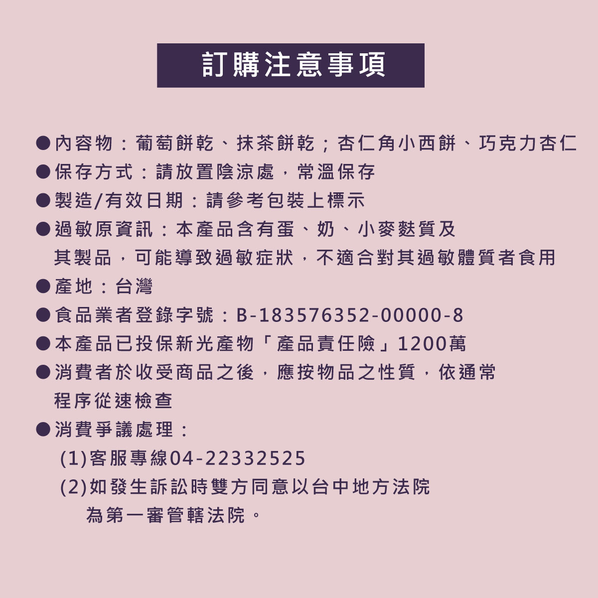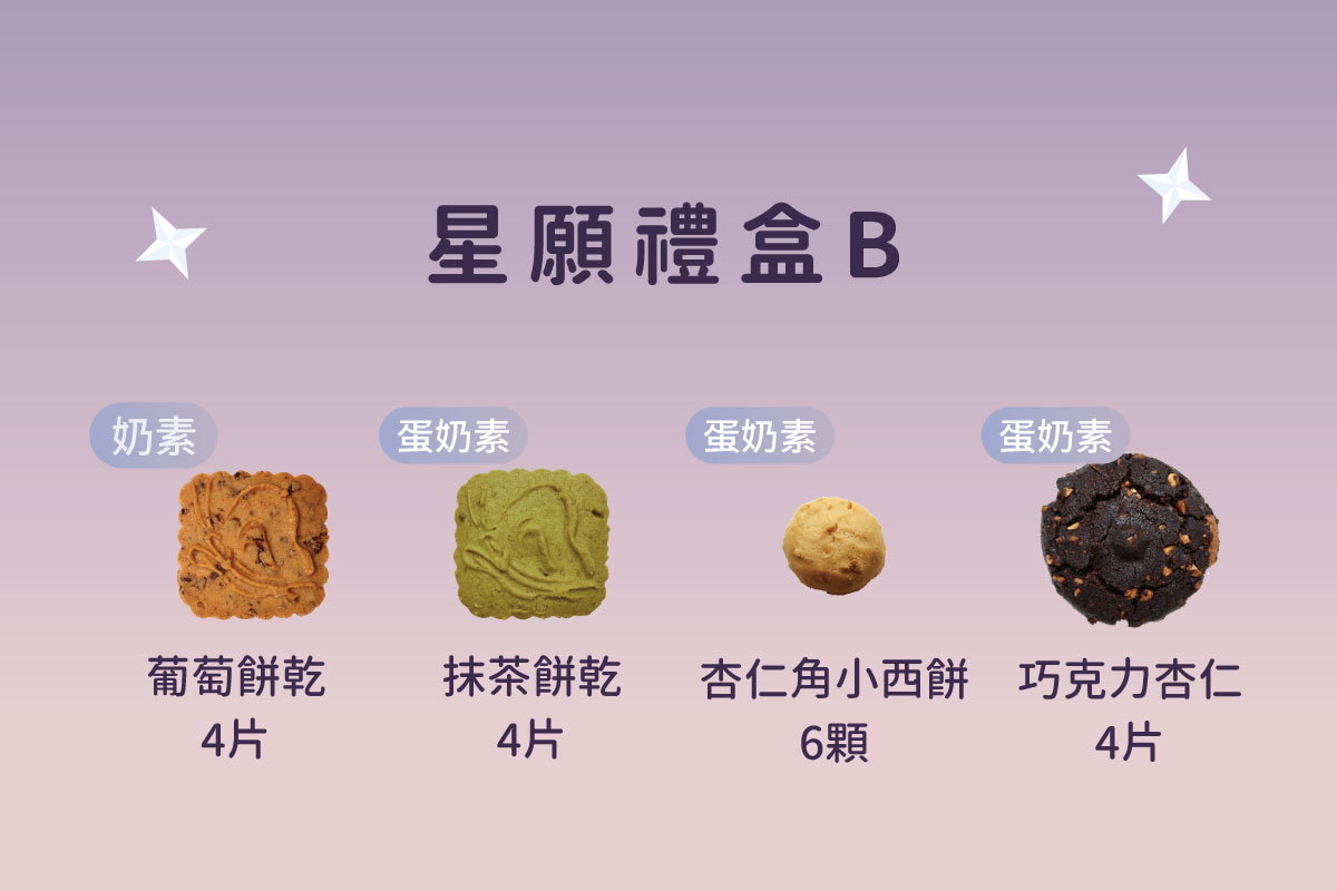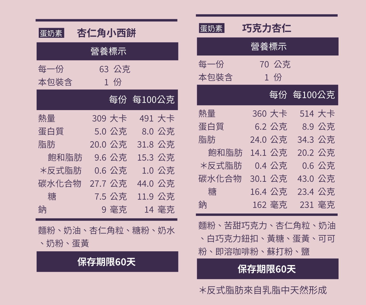 ※除葡萄餅乾為奶素,其餘品項皆為蛋奶素