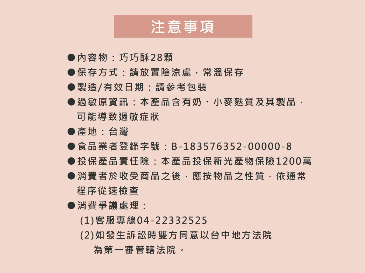 餅乾數量:巧巧酥28顆保存期限:到您手上至少還有40天包裝尺寸:長23 x 寬15cm x 底部6cm