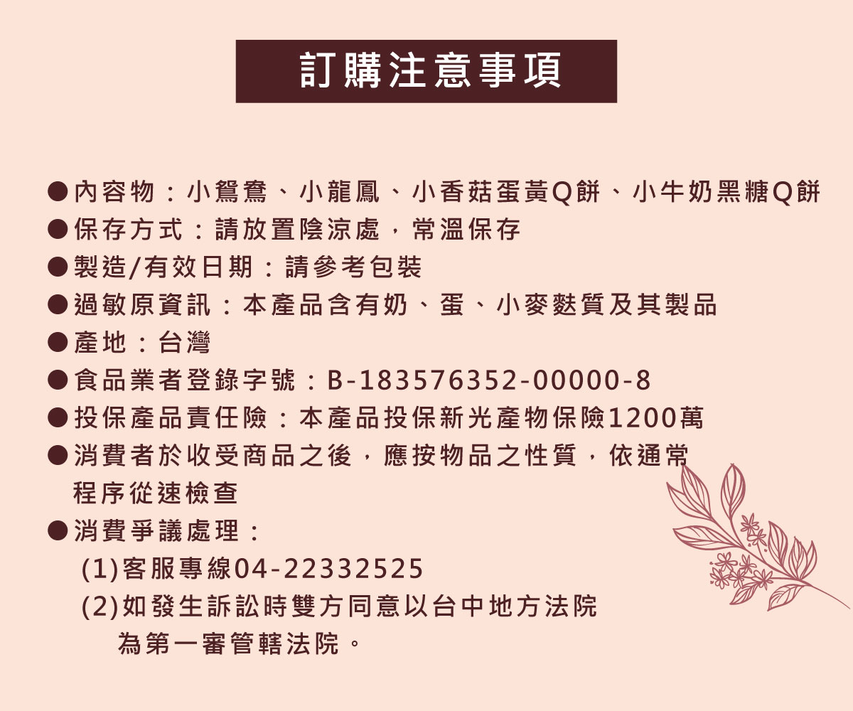 試吃內容:小鴛鴦餅一顆、小龍鳳餅一顆、香菇蛋黃Q餅一顆、牛奶黑糖Q餅一顆保存期限:大餅到您手上至少還有10天-----------------禮盒尺寸:20cm x 14cm x 9cm