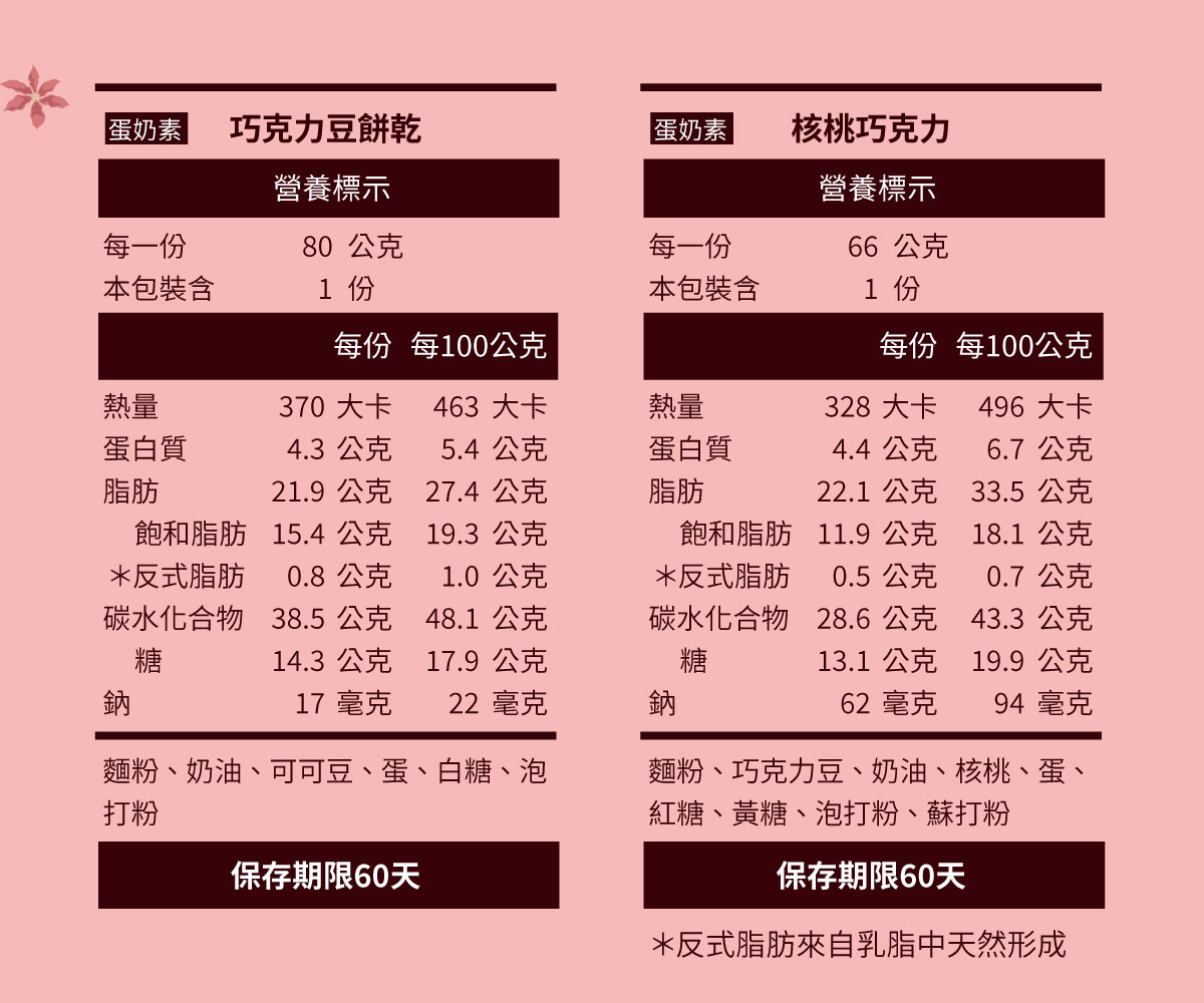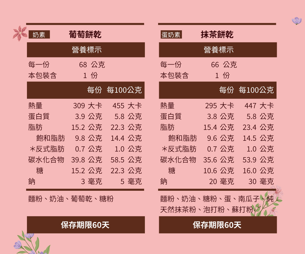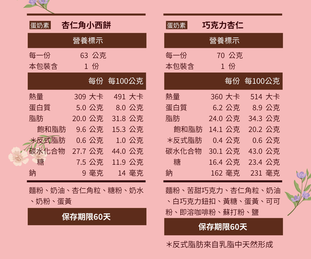 一、除葡萄餅乾為奶素,其餘品項皆為蛋奶素二、「核桃巧克力」產品原物料為農產品,可能含有果核、果殼,請小心食用。