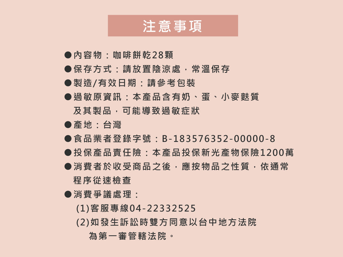 餅乾數量:咖啡餅乾28顆保存期限:到您手上至少還有40天包裝尺寸:長23 x 寬15cm x 底部6cm