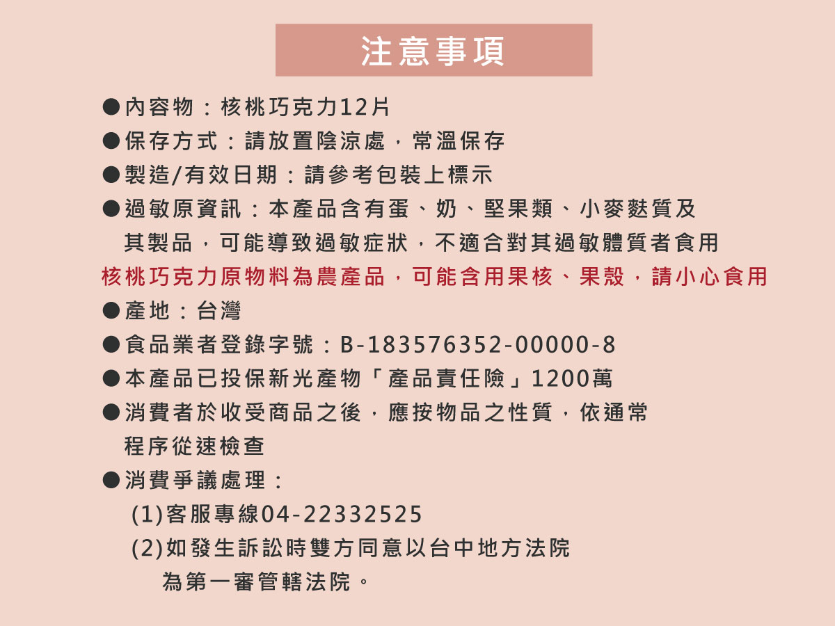 餅乾數量:核桃巧克力12片保存期限:到您手上至少還有40天包裝尺寸:長23 x 寬15cm x 底部6cm