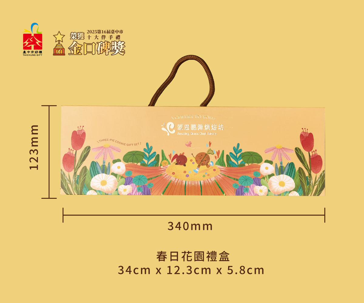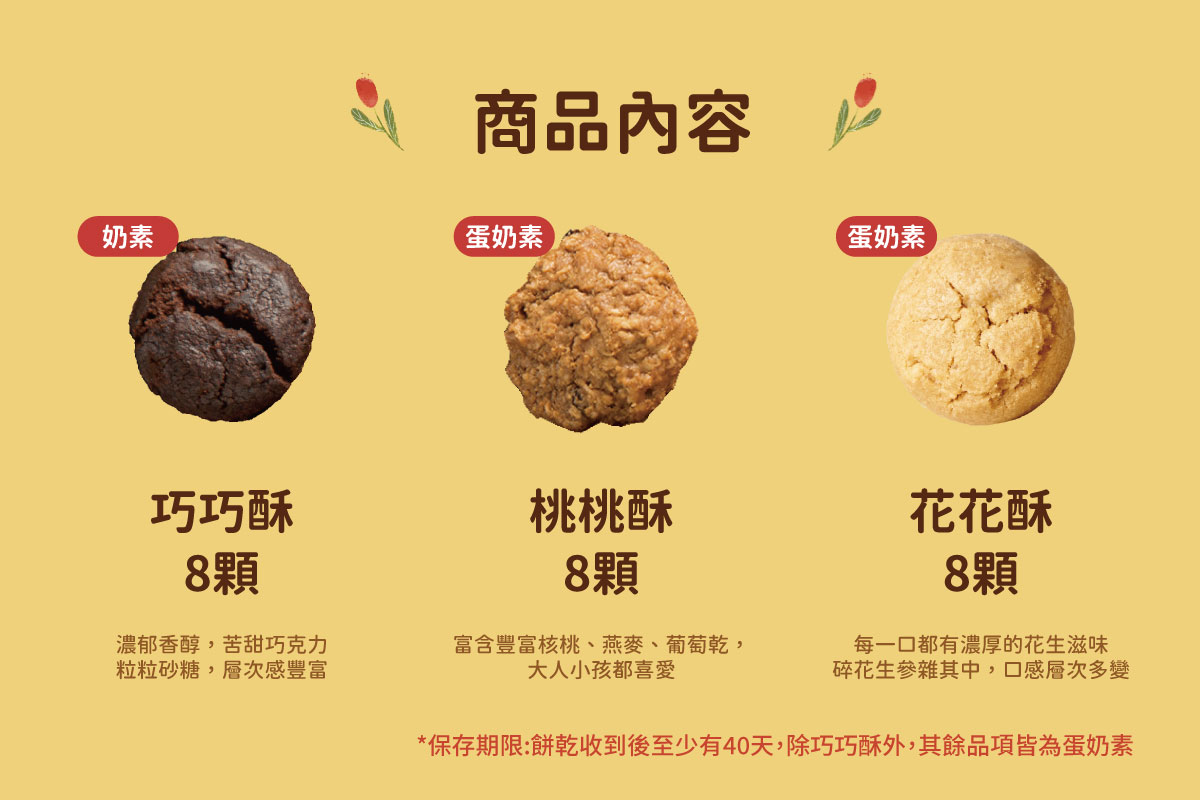 餅乾淨重:240公克餅乾數量:巧巧酥8顆、桃桃酥8顆、花花酥8顆保存期限:到您手上至少還有40天★禮盒皆為提繩設計★