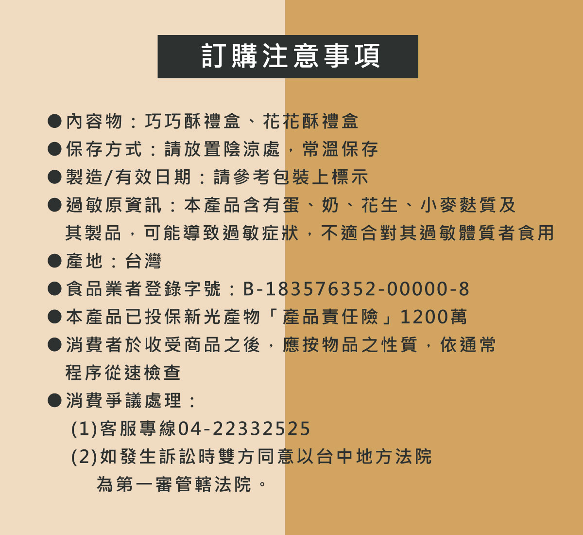 鐵盒口味:巧巧酥和花花酥各一盒保存期限:巧巧酥、花花酥到您手上至少還有40天----------禮盒尺寸:35cm x 18cm x 6.5cm提袋尺寸:35cm x 18cm x 20cm禮盒皆附提袋