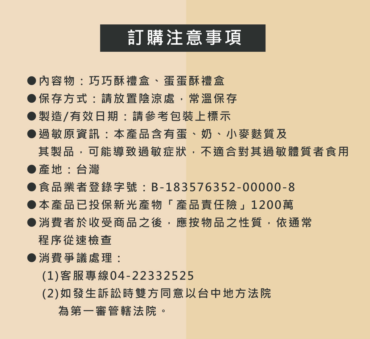 鐵盒口味:巧巧酥和蛋蛋酥各一盒保存期限:巧巧酥到您手上至少還有40天蛋蛋酥到您手上至少還有15天----------禮盒尺寸:35cm x 18cm x 6.5cm提袋尺寸:35cm x 18cm x 20cm禮盒皆附提袋