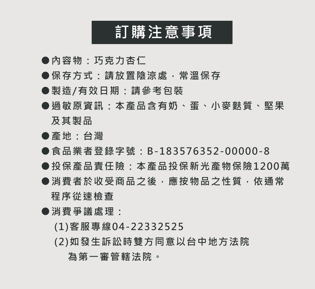 餅乾數量:巧克力杏仁4片保存期限:到您手上至少還有40天包裝尺寸:10.3cm x 10.3cm x 5cm