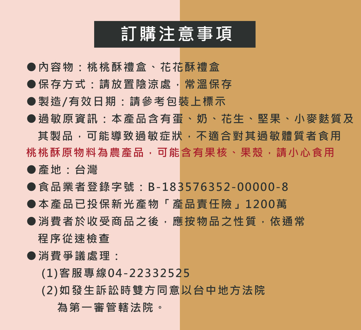 一、本產品均為蛋奶素二、「桃桃酥」產品原物料為農產品,可能含有果核、果殼,請小心食用。