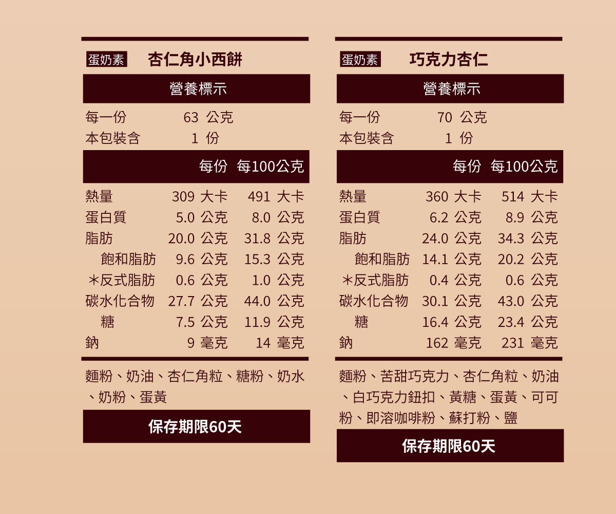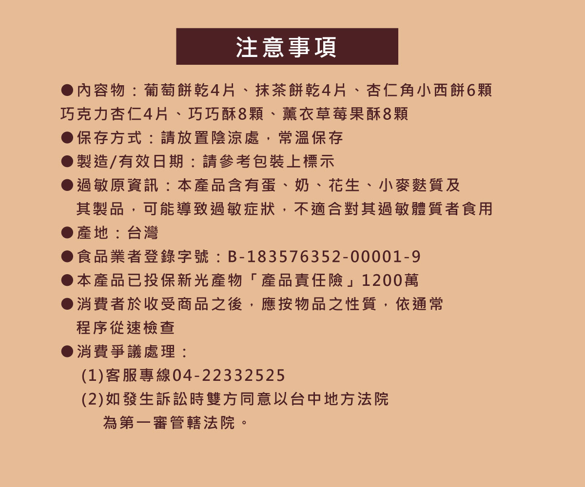 一、除葡萄餅乾、巧巧酥、薰衣草莓果酥為奶素,其餘品項皆為蛋奶素二、下單時請備註外盒款式,可選「漾粉盒」及「春芽盒」