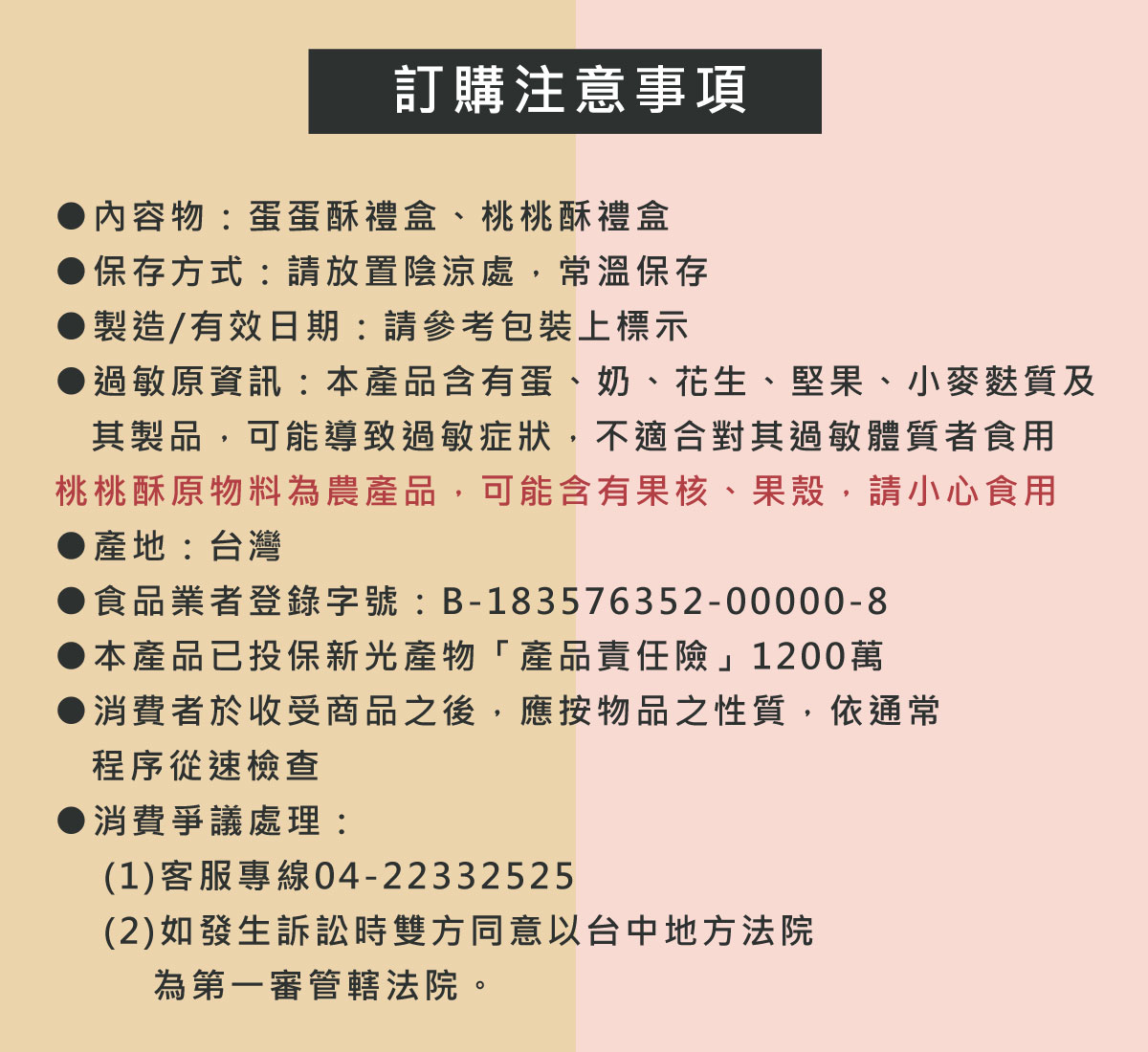 一、本產品均為蛋奶素二、「桃桃酥」產品原物料為農產品,可能含有果核、果殼,請小心食用。