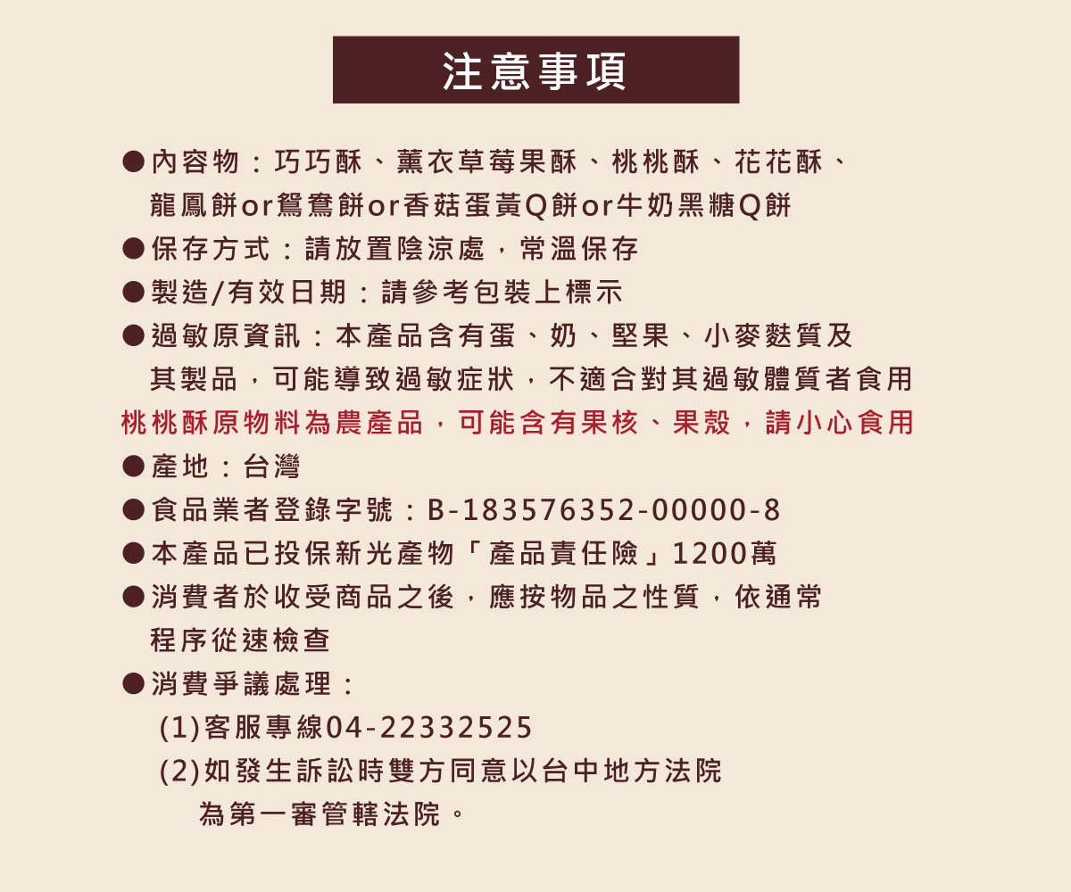 一、除巧巧酥、薰衣草莓果酥為奶素,其餘品項皆為蛋奶素二、「桃桃酥」產品原物料為農產品,可能含有果核、果殼或葡萄梗,請小心食用三、下單時請備註外盒款式,可選「玫瑰盒」、「木紋盒」、「熱戀盒」、「純愛盒」及「鵲悅盒」
