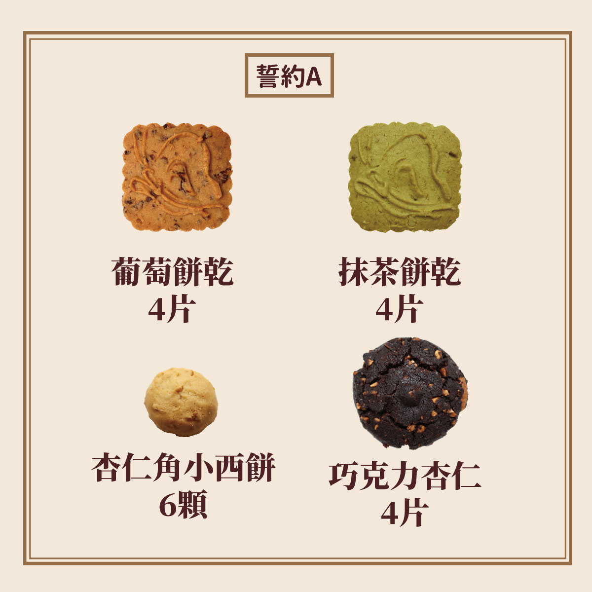 禮盒內容:葡萄餅乾4片、抹茶餅乾4片、杏仁角小西餅6顆、巧克力杏仁4片大餅為香菇蛋黃Q餅保存期限:餅乾到您手上至少還有40天大餅到您手上至少還有10天-----------------禮盒尺寸:26cm × 24cm × 12cm禮盒為提繩設計,無提袋