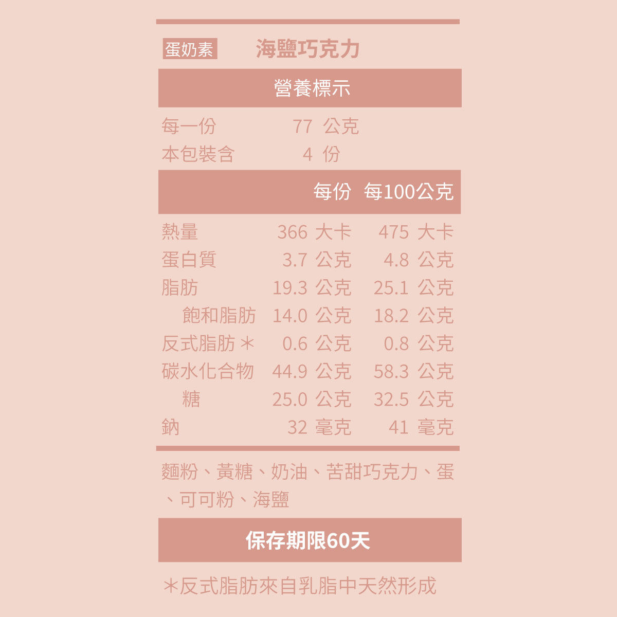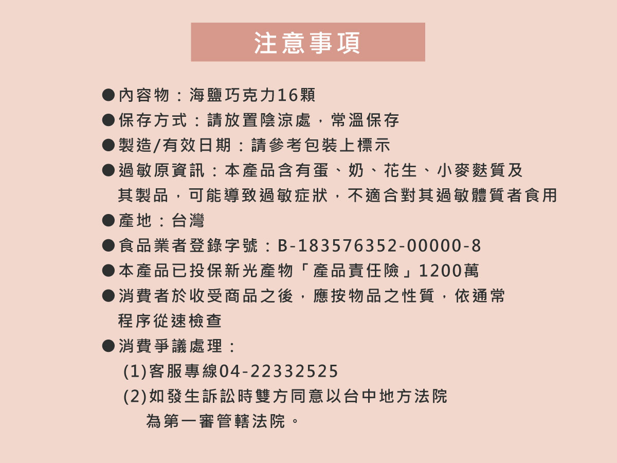 餅乾數量:海鹽巧克力16片保存期限:到您手上至少還有40天包裝尺寸:長23 x 寬15cm x 底部6cm