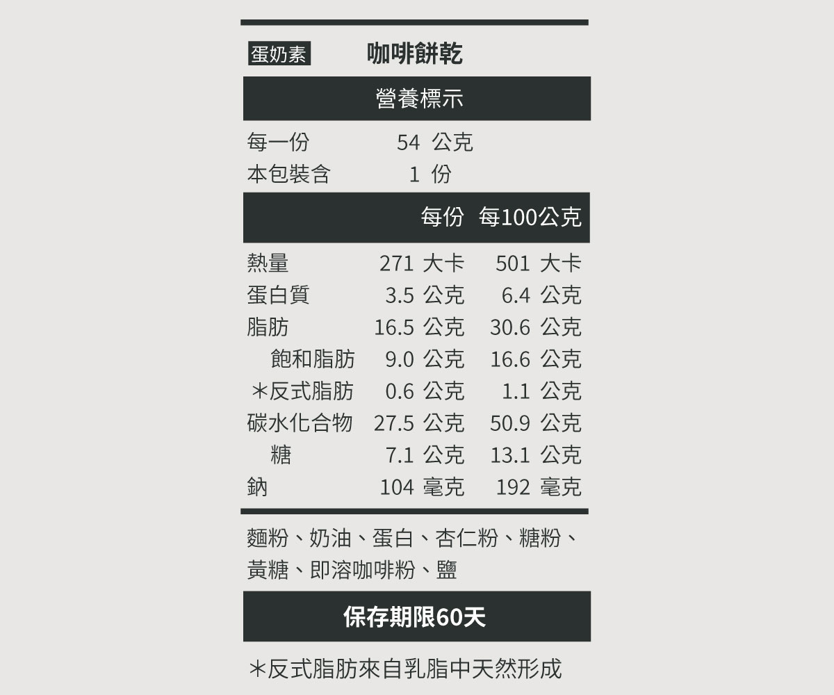 餅乾數量:咖啡餅乾6顆保存期限:到您手上至少還有40天包裝尺寸:10.3cm x 10.3cm x 5cm