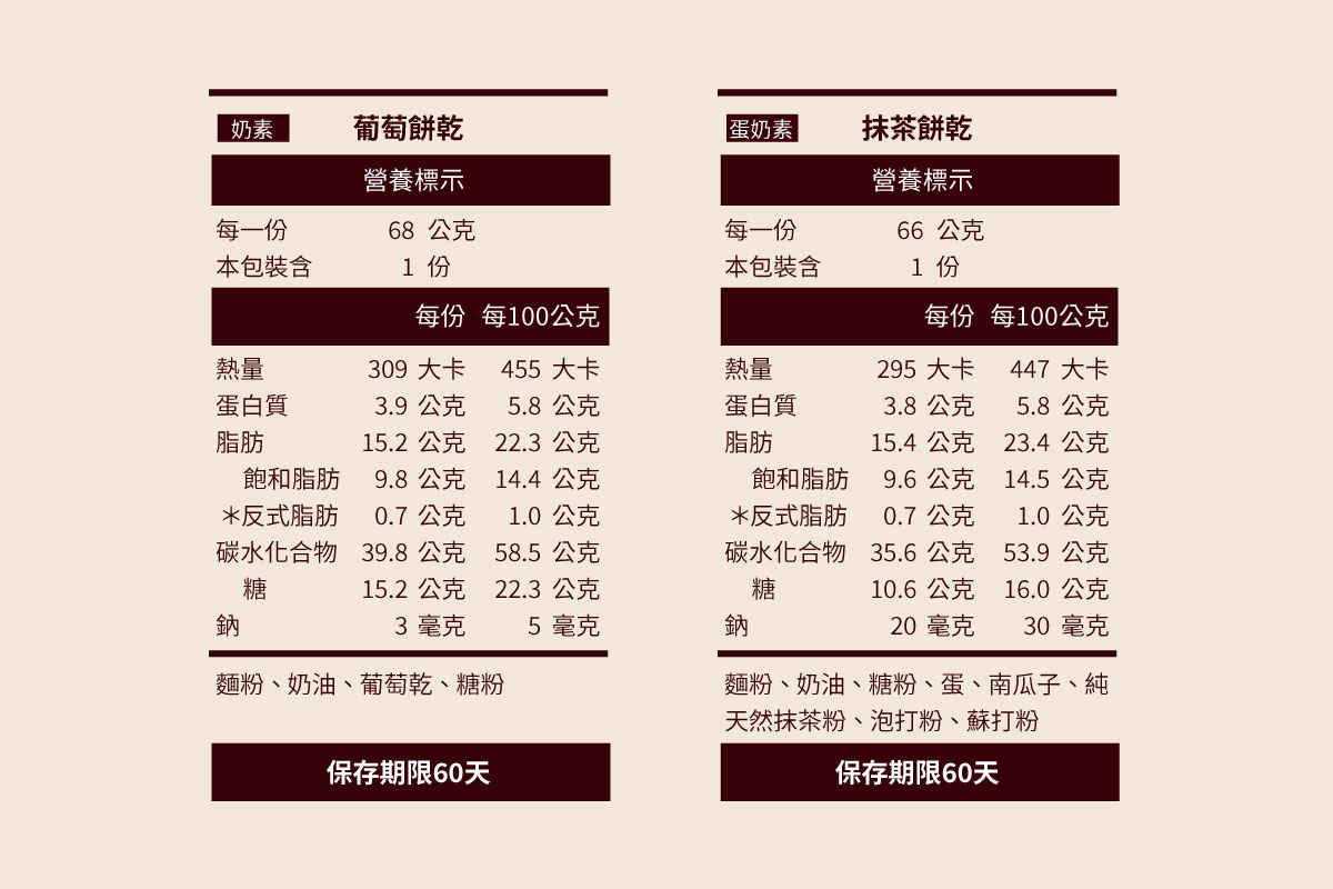 一、除葡萄餅乾為奶素,其餘品項皆為蛋奶素