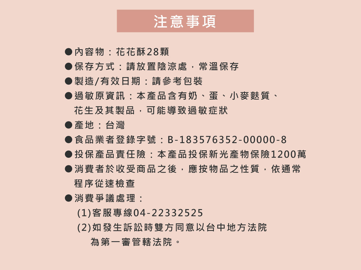 餅乾數量:花花酥28顆保存期限:到您手上至少還有40天包裝尺寸:長23 x 寬15cm x 底部6cm