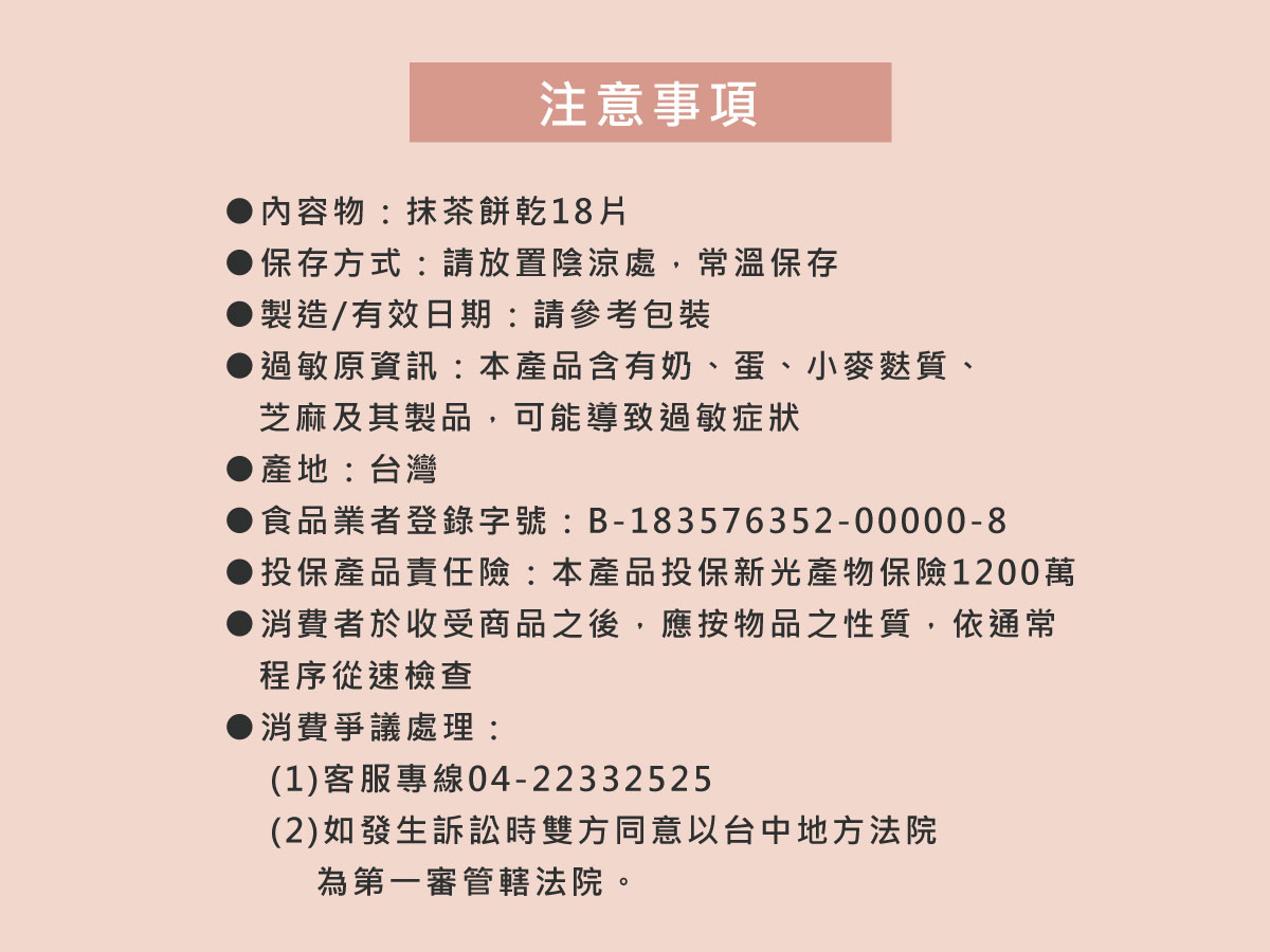 餅乾數量:抺茶餅乾18片保存期限:到您手上至少還有40天包裝尺寸:長23 x 寬15cm x 底部6cm