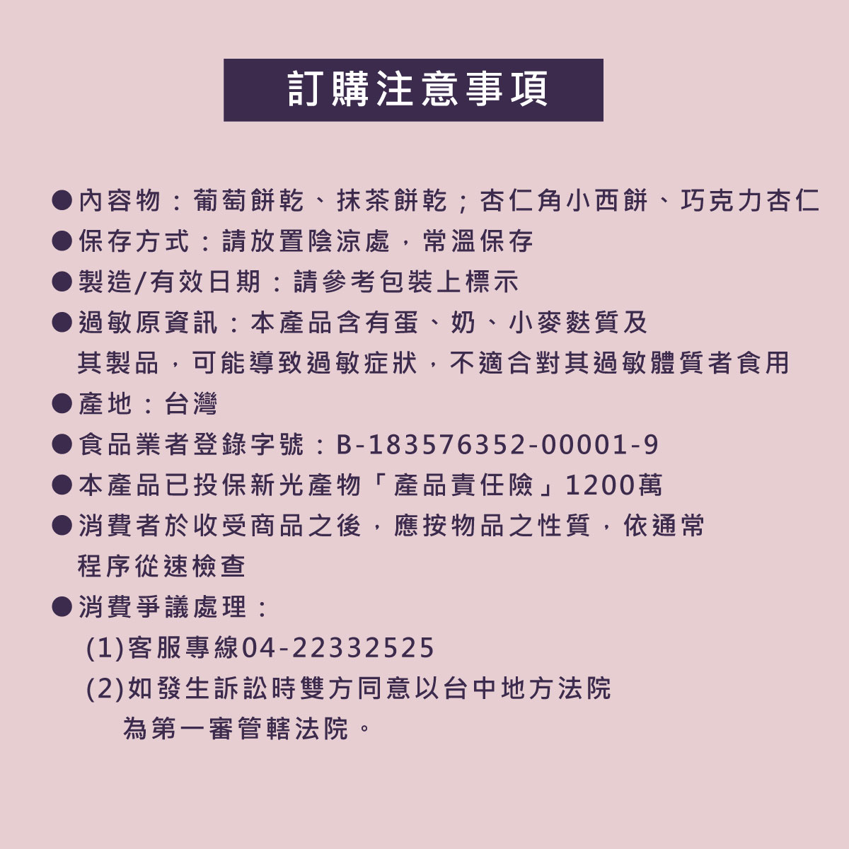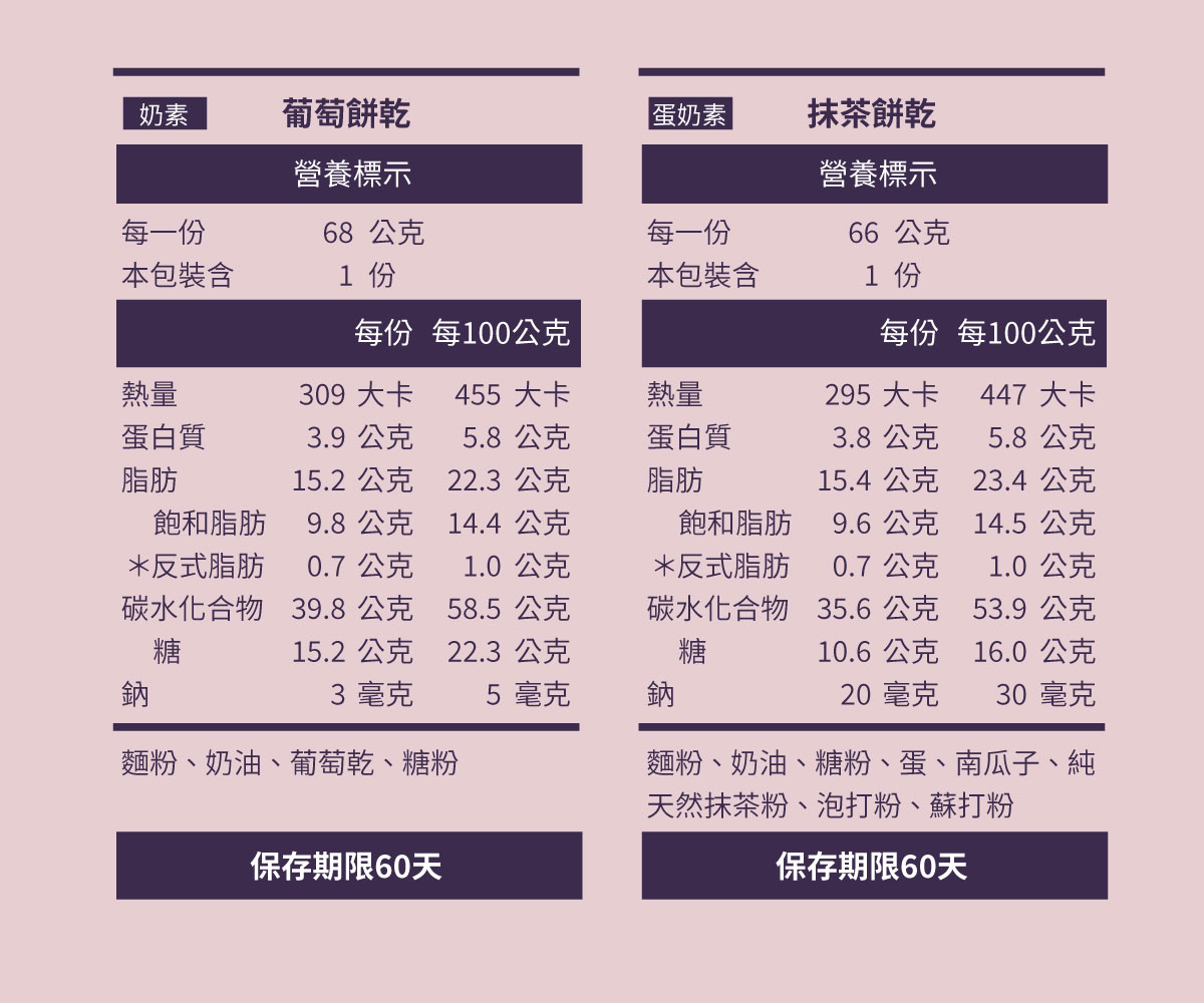葡萄餅乾4片、抹茶餅乾4片杏仁角西餅6顆、巧克力杏仁4片----※除葡萄餅乾為奶素,其餘品項皆為蛋奶素