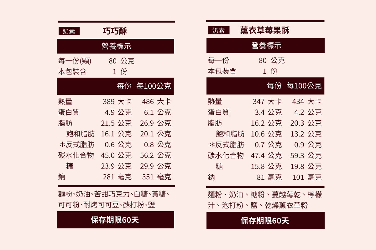 除葡萄餅乾、巧巧酥、薰衣草莓果酥為奶素,其餘品項皆為蛋奶素